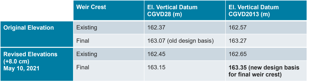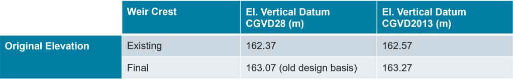 - The existing weir crest elevation is +8.0 cm higher than the 162.37 m CGVD 28 indicated in past documentation.