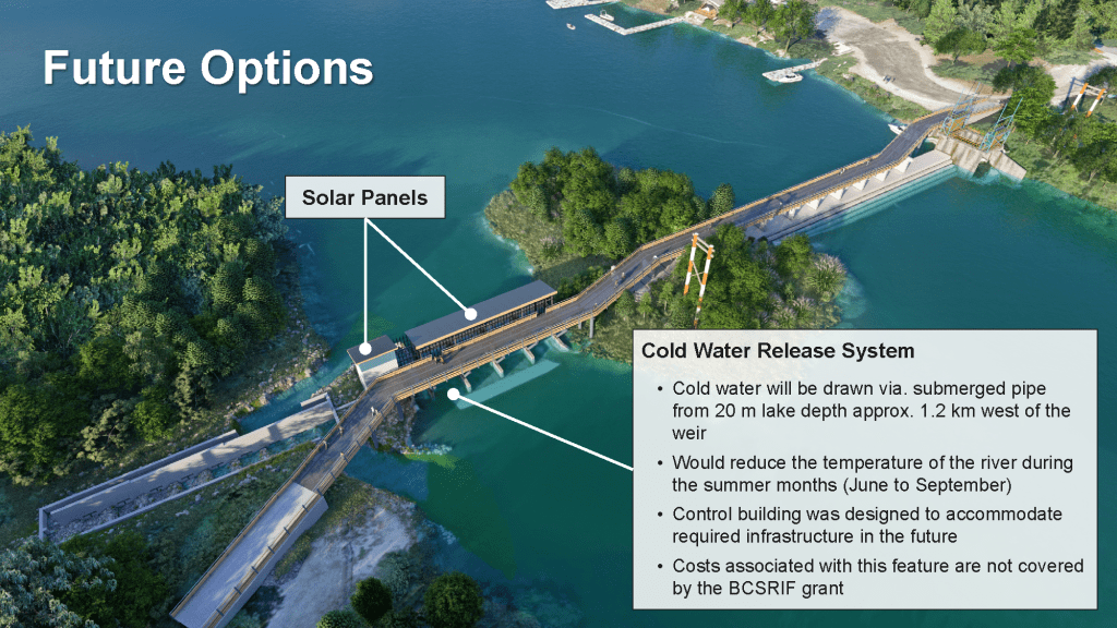 Although not within the funding mandate of the BCSRIF grant, the preliminary design of a new walkway was included in an expanded scope for this project. The design of the new weir can accommodate the walkway in the future.
