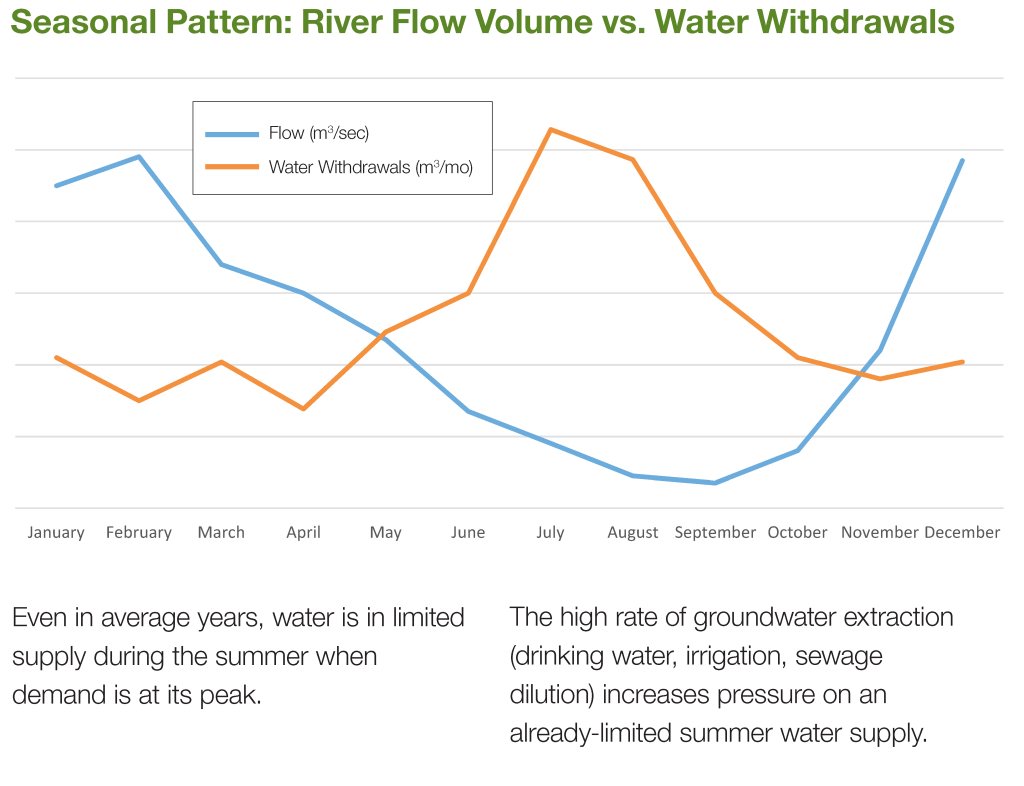 The images below from the WUP public meeting in October of 2017, illustrate how the demand for water in the summer is surpassing the supply.
